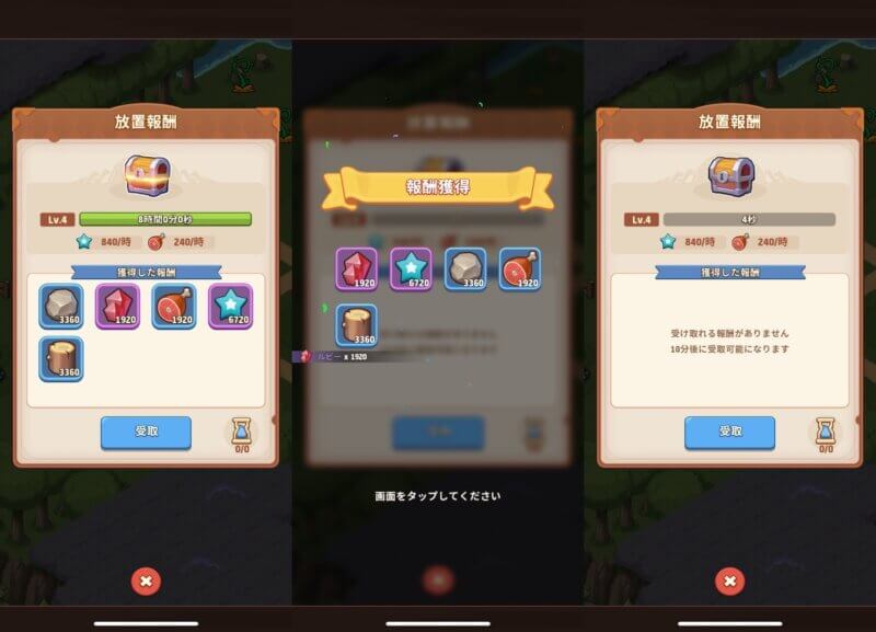 放置報酬はレベルに応じて増えていくので、遊べば遊ぶほど報酬が増えます!