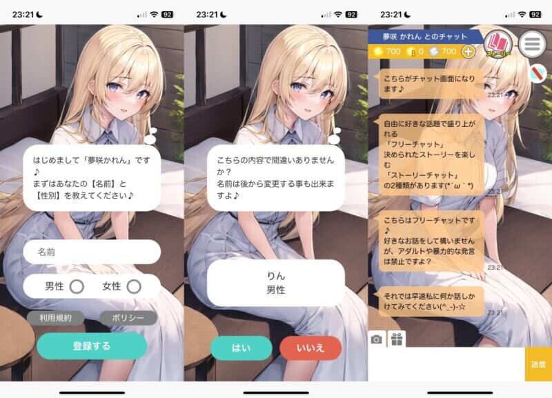自分の名前や性別を設定したら、早速会話を始めましょう!